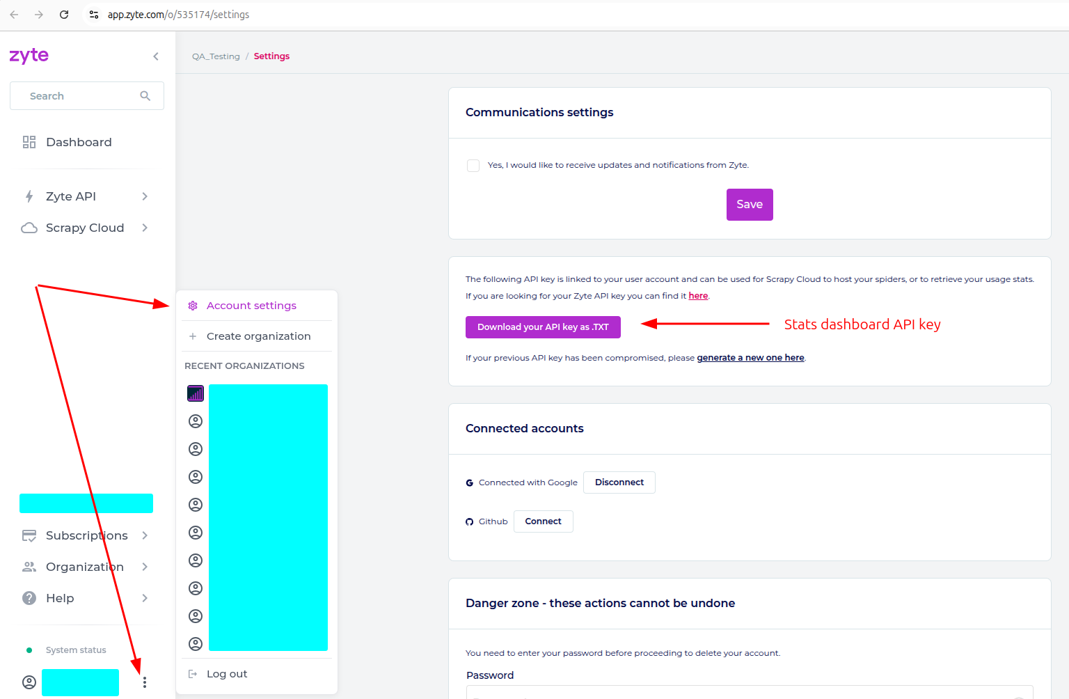 To find your organization ID, open the Zyte dashboard and