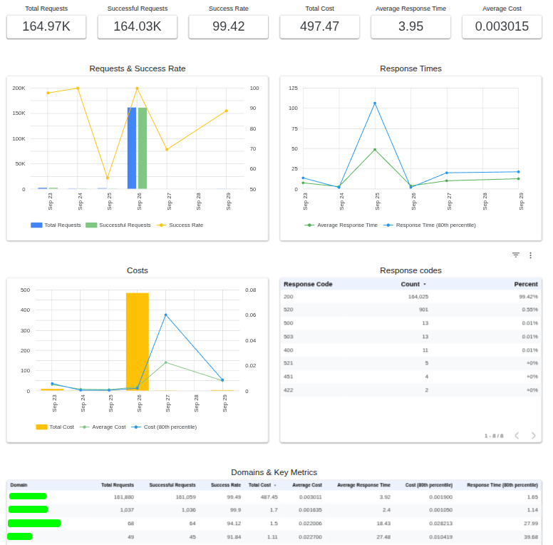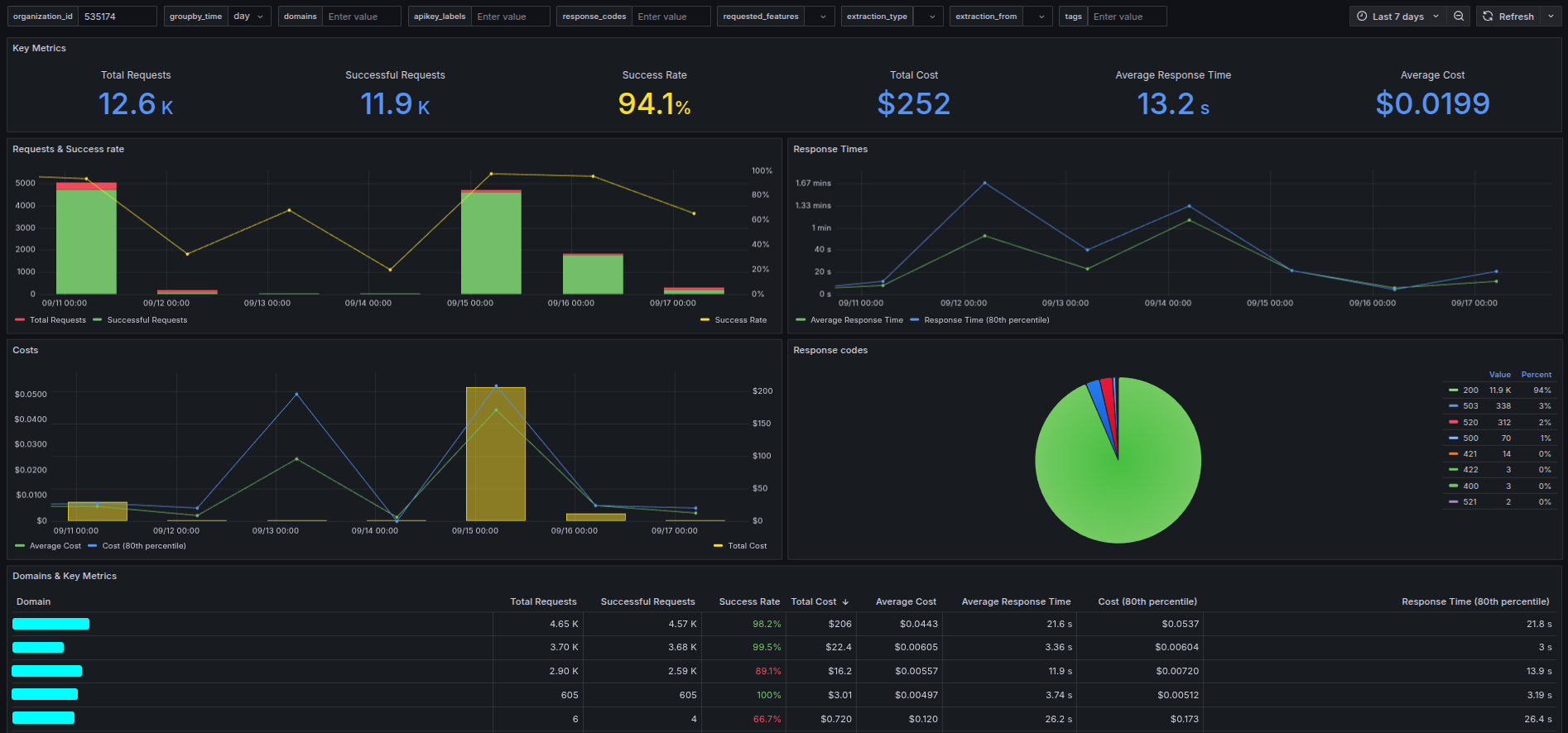 The Zyte dashboard has a Stats page that lets you monitor different aspects of your Zyte API requests, including cost, response time, or features used.