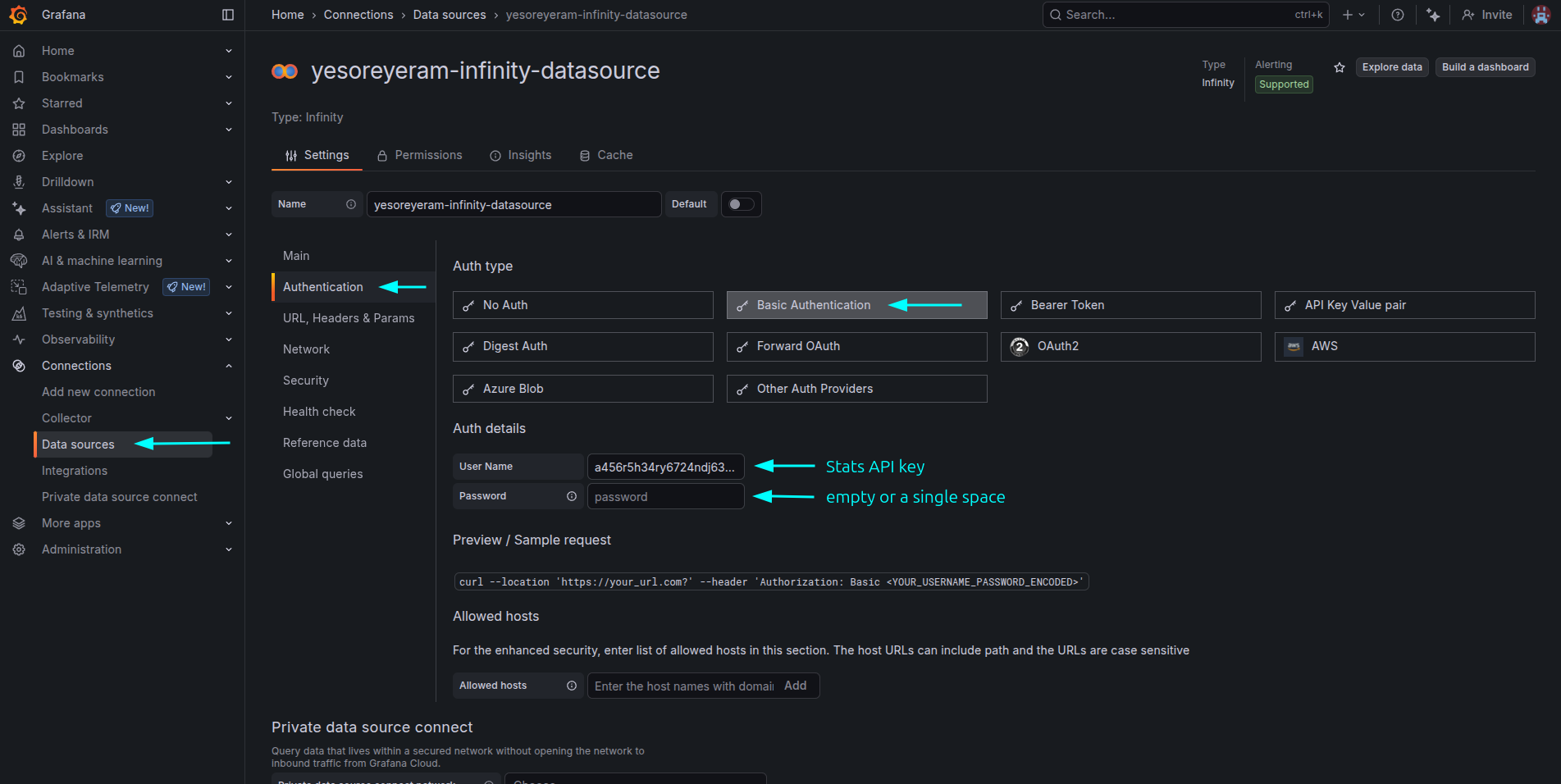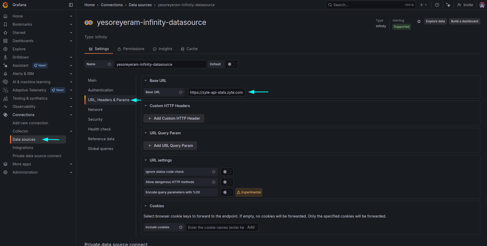 Add the newly installed data source into the Data Sources section and configure it to fetch data from https://zyte-api-stats.zyte.com with your Stats dashboard API key.